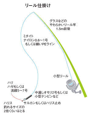 ミチイト0.6〜1号を竿の長さとり、オモリ(2号程度)、ハリは赤ハゼもしくは流線5〜7号針をつける。