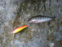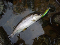 3投目、光の反射でチェイスは見えなかったが、キラっとヒラを打つと同時に、ロッドに魚の感触が伝わってきた。1尾目なので慎重に寄せると、23cmのヤマメだった。