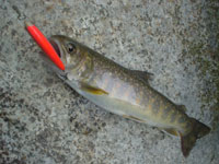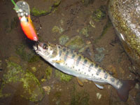 しばらく魚影は見えなかったが、少しのぼったところで小魚のチェイスがあった。再びキャストをすると、水面を飛び出すほどの激しいアタックをし始め、数投後にヒットした。ウグイだろうと思っていたが、近くまで寄せるとヤマメだった。その後、ヤマメを数尾追加したところで場所を移動。