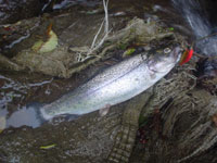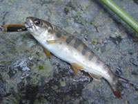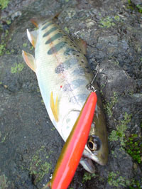 上流側へ移動すると、中型のヤマメが数尾みられたが、ルアーには無反応。いかにもなポイントなのでスレきっているようだ。その先の落ち込みでキャストすると、チェイスがあった。次のキャストでヒット。小さなイワナだった。続けてキャストをすると流芯からゆら〜っと中型イワナが出てきた。数回反応するがバイトはせず、しばらくすると反応しなくなった。