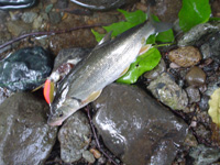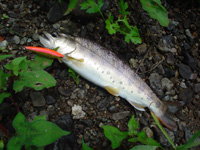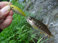 そこからしばらく上がったところで、ホリえもんに、やっとまともなサイズのヤマメがヒット。ルアーを見ると、絶版ザウルスのレックスシンキング。ただ引きルアーなのに釣れるんだなぁ。ホリえもん的には「時代はただ引き」のようだ。そこでまさかずも自作のウォブリングミノーに代えると、ウグイ、チビヤマメがヒット。だけど、やはり自分の釣り方には合わないので元のルアーに戻す。