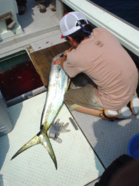 船長が言った後すぐ、フックオフ。どうやらシイラは掛けた直後は走らせて、疲れてから取り込むらしい。