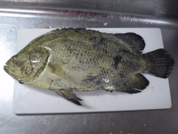 どうしようかとあたふたしていると、まるこさんにヒット! が、残念ながら手前まで寄せたところでフックオフ。同じポイントでだっちーさんとせいさんがペンペンをキャッチ。あと、ナゾの古代魚も。