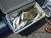 ジグで底をしゃくると、グングングンとサバの引きがした。まさかずもサバをゲット。締めてクーラーに入れたが、次から次へと上がるサバ。そのうちワカシもまじり、船上は入れぐい状態。絞めるのは後にして、釣りに専念。