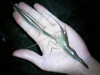 手を伸ばすと手のひらからはみだすくらいの大きさ。21.5cmのぷっくり太ったテナガエビ。