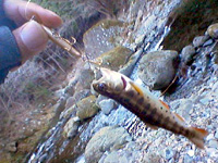 しばらく釣り上がるも気配なし……。少し上がったところで待望の1尾目をキャッチするものの小ヤマメ。その後はさらにサイズダウン。