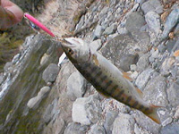スタート地点まで戻って、今度は下流を少し釣ってみることに。全然魚っ気がなかったが、ちょっと降りたところに堰堤を発見。堰堤上からチップミノーをサスペンドさせると、下からヤマメが姿を現した。トゥイッチさせるとヒット! 今日初めてのヤマメゲット!