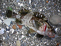 また移動すると、1キャスト目でヒット! しかしその後が続かず、ガツンといういいアタリはあるものの載らない。次に載ったと思ったら、かなりいい引き! 上げてみると、19cmと小さなムラソイだったが、この引きには少し満足。